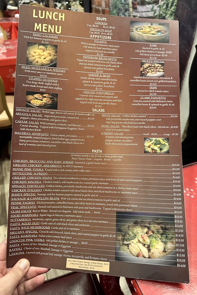 Macera's Italian Restaurant captures the essence of authentic Italian cuisine, nestled in Cranston, RI. With a menu that caters to diverse tastes, patrons can savor dishes like the exquisite chicken escarole soup and crispy fried calamari, perfectly paired with house-made bread. The standout gnocchi, featuring olives and red roasted peppers, leaves a lasting impression, while the versatile pizza options cater to both vegetarian and meat lovers alike.